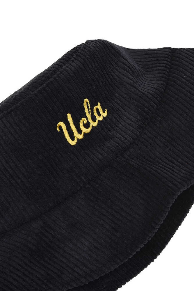 Kışlık kadife kumaştan, önde kontrast ''Script Ucla'' nakışlı bucket şapka.