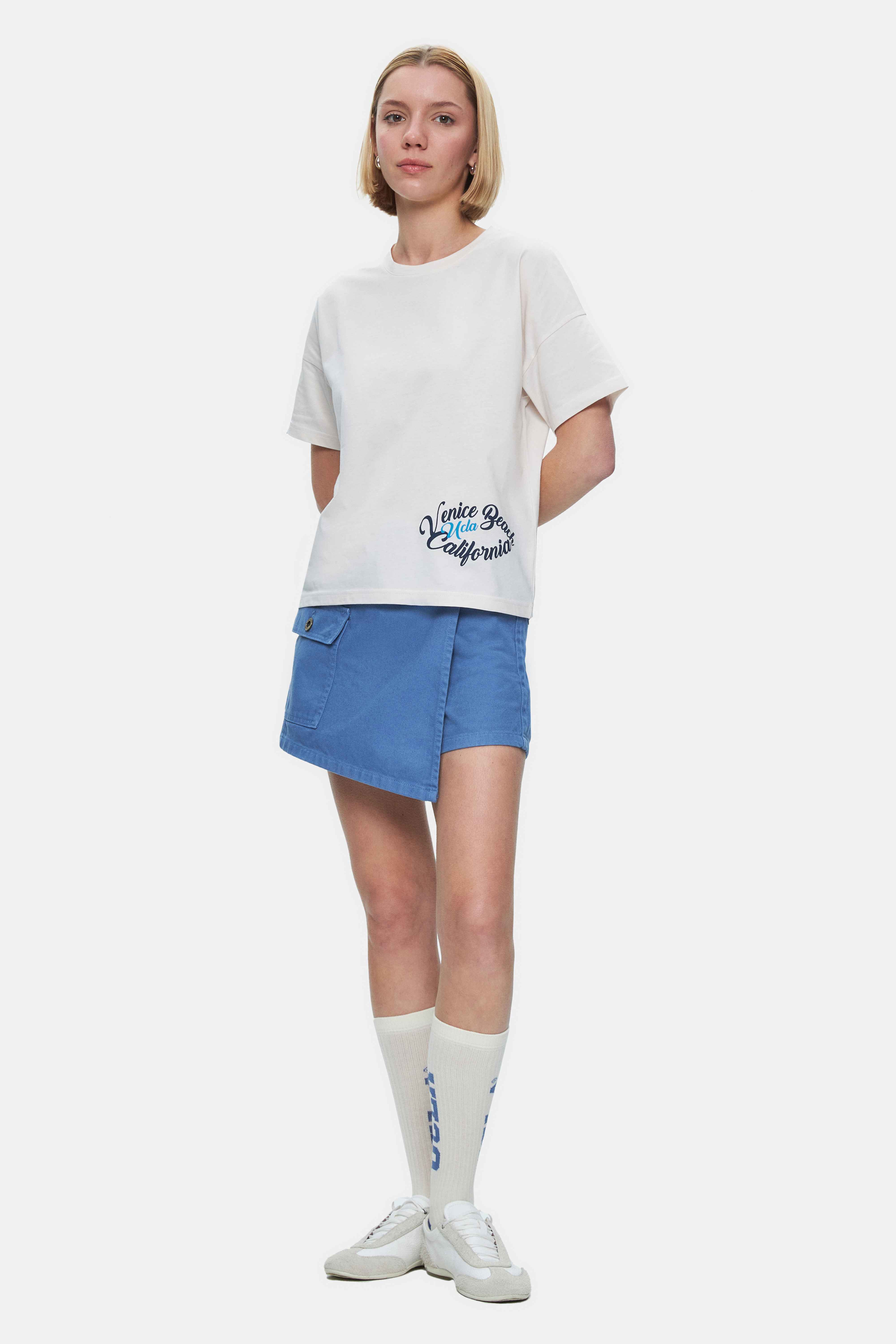 ODETTE Kemik Rengi Bisiklet Yaka Varak Baskılı Loose Fit Kadın Tshirt
